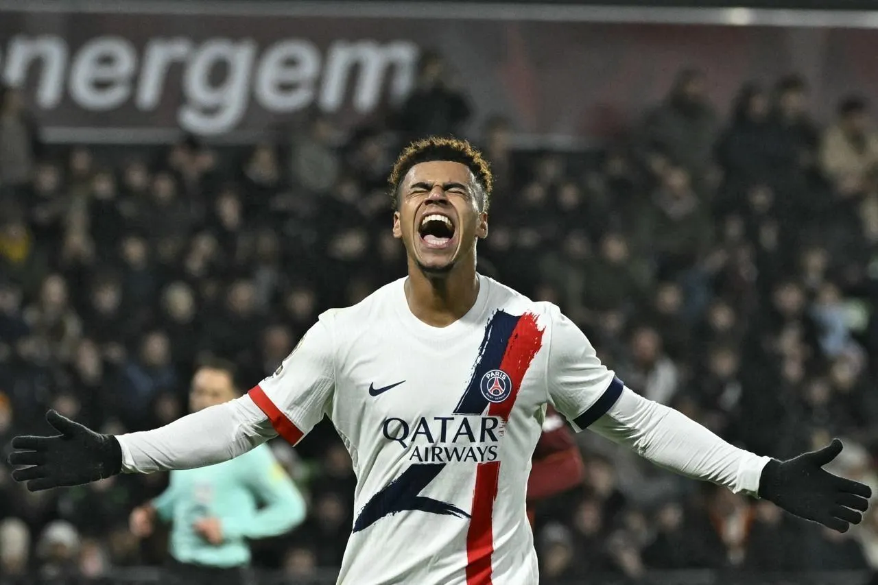Désiré Doué après son but face à Metz. JEAN-CHRISTOPHE VERHAEGEN / AFP