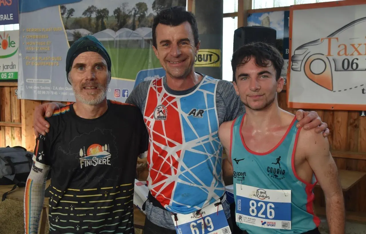 Le podium du 9 km masculin avec (de gauche à droite) : Jean-Marie Diverrez (3e), Sébastien Champion (1er) et Maxence Jaouen (2e). © Vincent LABBE-POQUET